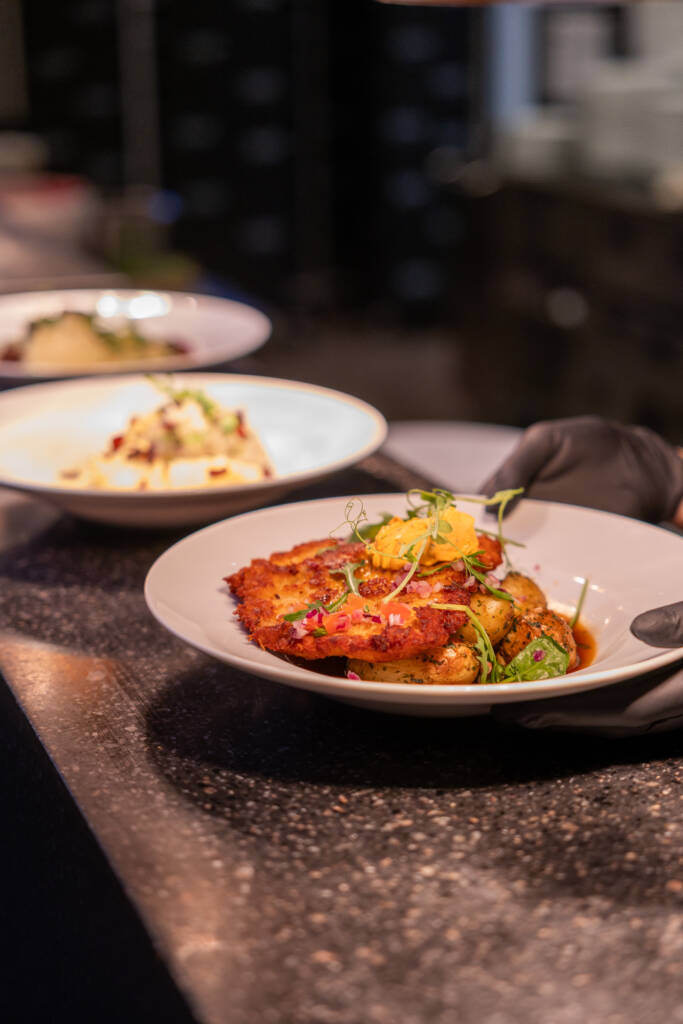 Serveras med potatisduchesse toppas med kräftstjärtar & räkor